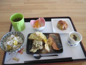 15日のメニューは栗ご飯、生鮭の塩焼きと秋の野菜の天ぷら添え、柿なます、松茸の茶わん蒸し、アップルパイでした。