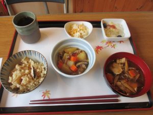 23日は松茸ご飯、キノコと牛肉のしぐれ煮、柿の白和え、イチジク、梨のゼリー添えでした。