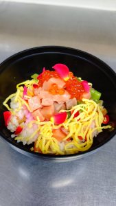 お正月、1月1日のお食事は、食用のお花をあしらった、海鮮花びらちらし寿司でした。