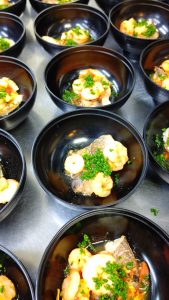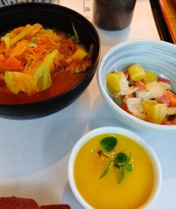 海の幸のブイヤベース仕立て、さつまいもと彩り野菜サラダ、チョコレートムースにオレンジソースを添えたデザート