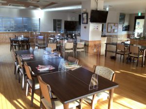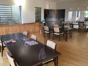 そして、すべてのテーブルに飛散防止のパネルを設置しています。