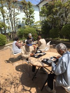 サロンいづみでは、お庭で日光浴や昼食を楽しんでいます。