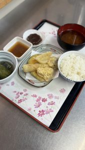 10月16日のメニュは秋野菜の天ぷら、秋茄子の煮浸し、水羊羹