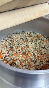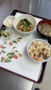 11月20日のメニューは松茸風木の子の炊き込みご飯、芋煮汁、鶏肉のさっぱり煮、胡瓜の梅肉和え、柿の白和え