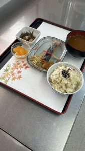 11月21日は秋鮭の塩焼き、さつまいもご飯、みかん、糸昆布の煮物で秋の味覚を利用者様、入居者様に楽しんで頂きました。